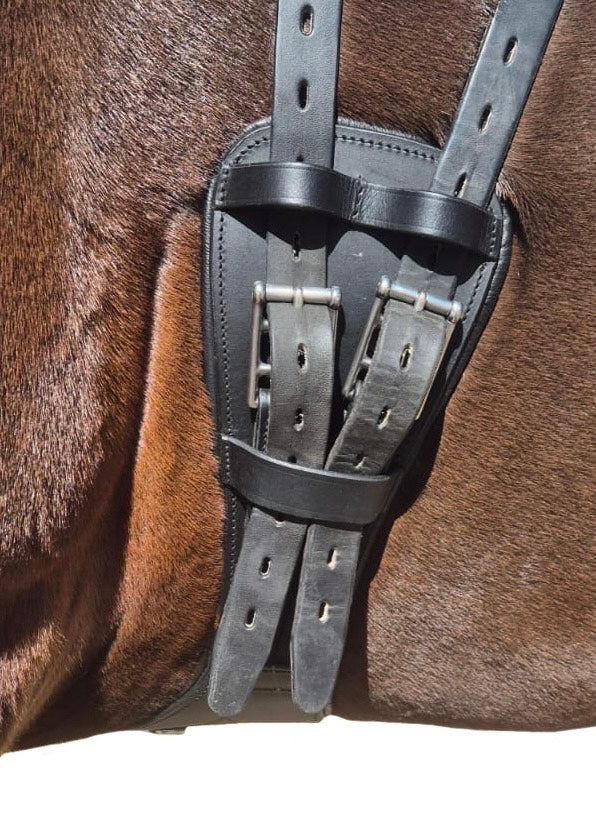 It features elastic which is strong and durable so it won’t stretch and prevent over tightening. Featuring a d ring to attach a breastplate or training aid to.