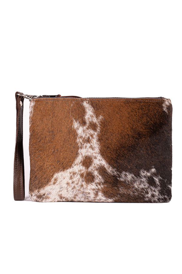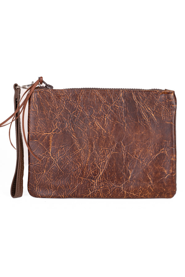 100% Australian made and cotton lined, these embossed leather clutches are the “go to” bag for everyday use or a weekend out. Top single YKK zipper closure with leather pull and leather wrist strap. Features an internal side pocket. Embossed leather front and plain leather back.