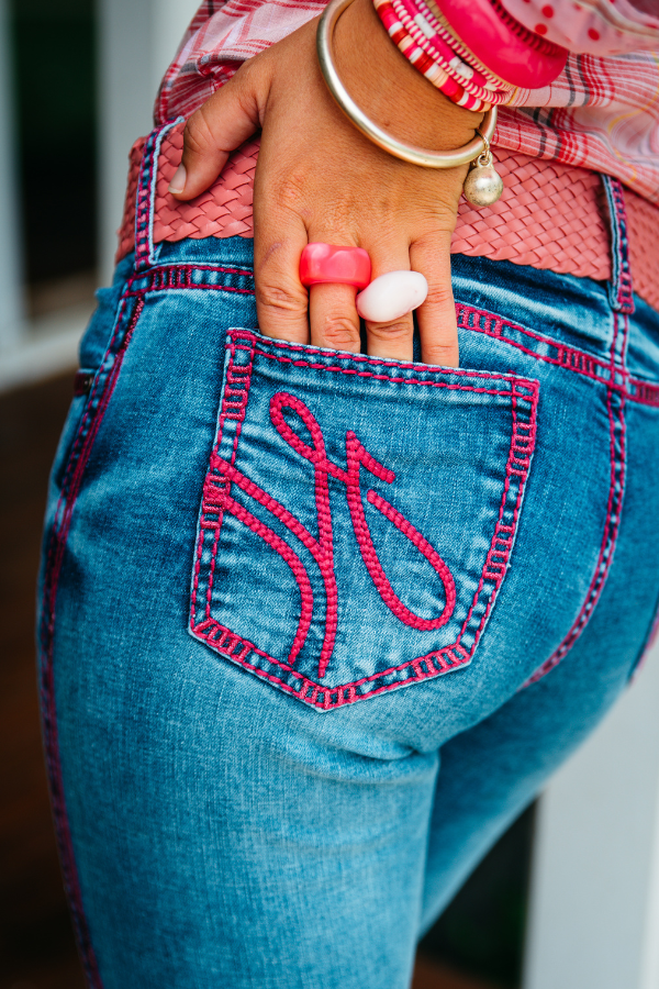 The “Belmont” is a mid blue stone wash finish denim featuring hot pink coloured stitching with metallic pink swirl detailing. Gentle whiskering at the thigh, and back of the knees. Light spray front and back thigh and backs of the knees. Dark tagging detail to the back yoke and hem line. No physical distressing to the denim.
