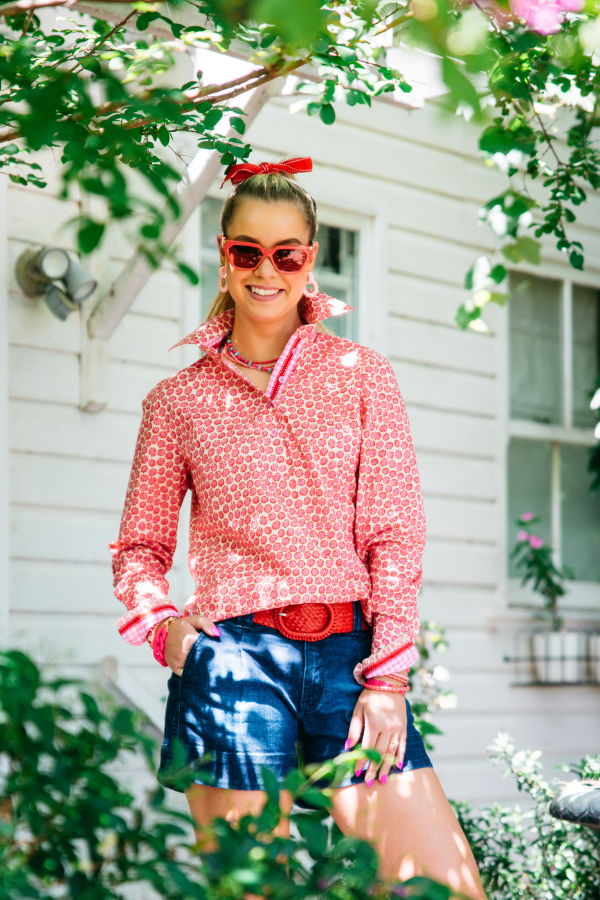 Tailored from a unique lightweight, stretch polished cotton fabric, this shirt is trimmed with pink and white gingham fabric and finished with red and white topstitched grosgrain ribbon. A summer classic, this shirt will match with a wide variety of bottom co-ordinates for an easy, ‘go-to’ outfit. No darts front or back makes this shirt the roomiest of all our styles. Regular turn down collar with a little ruffle at the 5″, 4 button cuff. Extra long sleeve and body allowance. * Now offered in size 6.