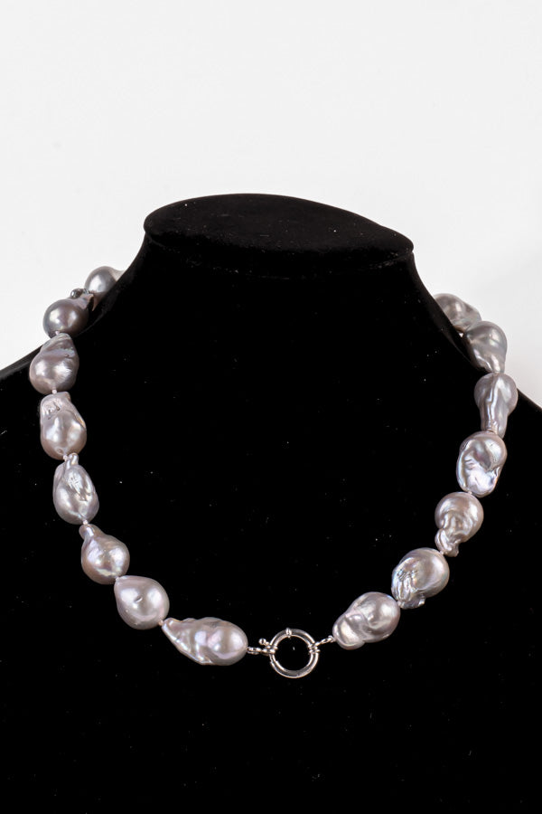 Cultured freshwater baroque pearl necklace. Extra large 26-28mm baroque pearl necklace with 925 Sterling Sliver bolt clasp. Measuring slightly longer at approx 21″ in length including the clasp. These pearls are an absolute standout feature piece that will be the envy of many! Silver colour with excellent lustre.