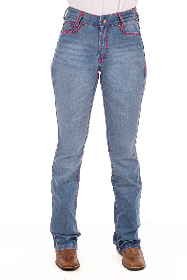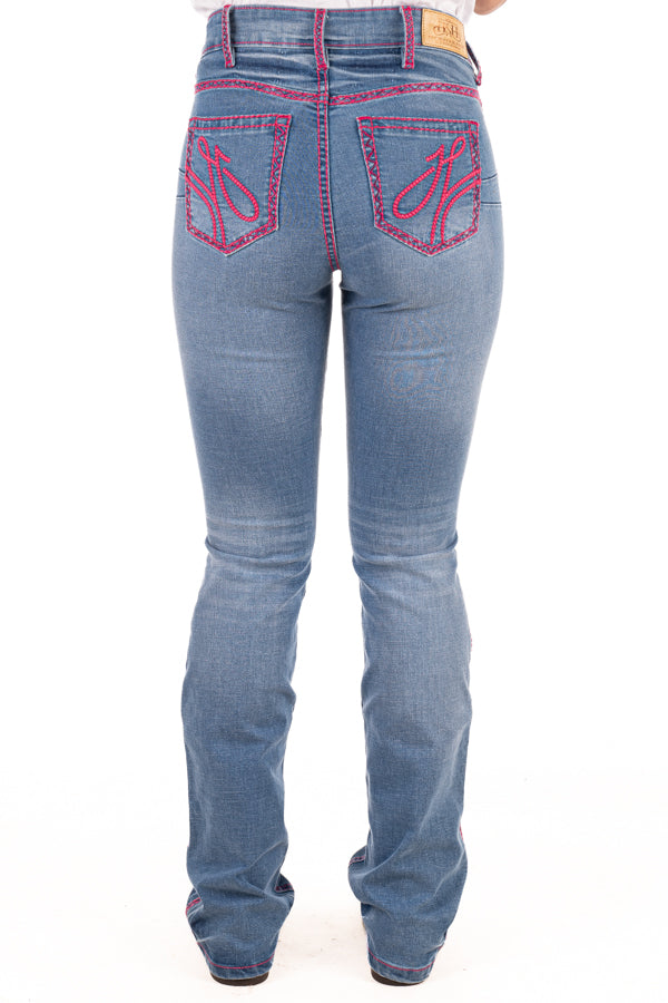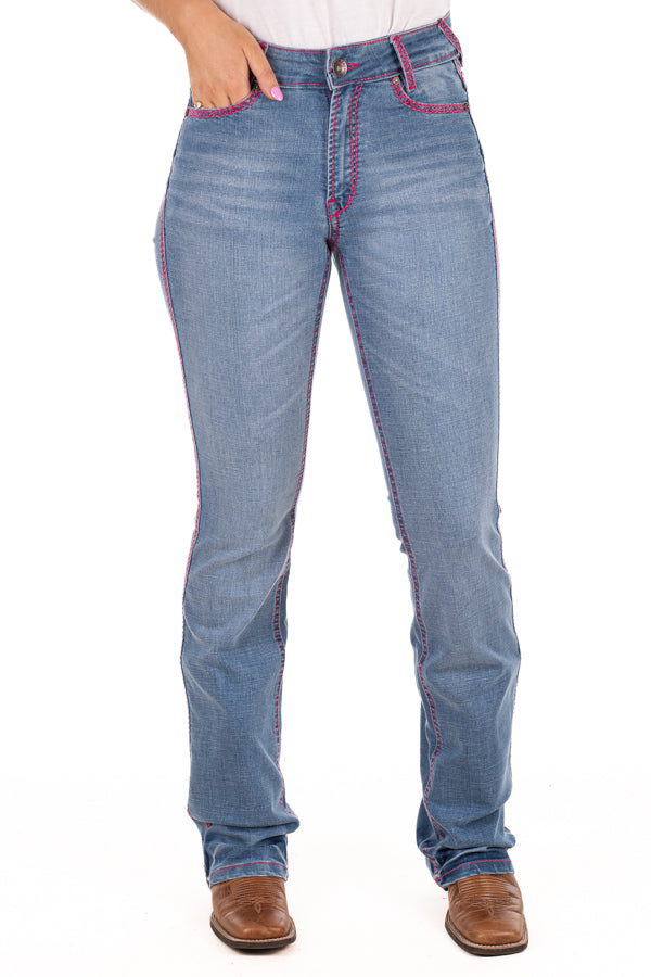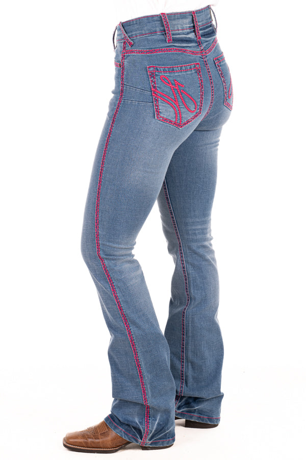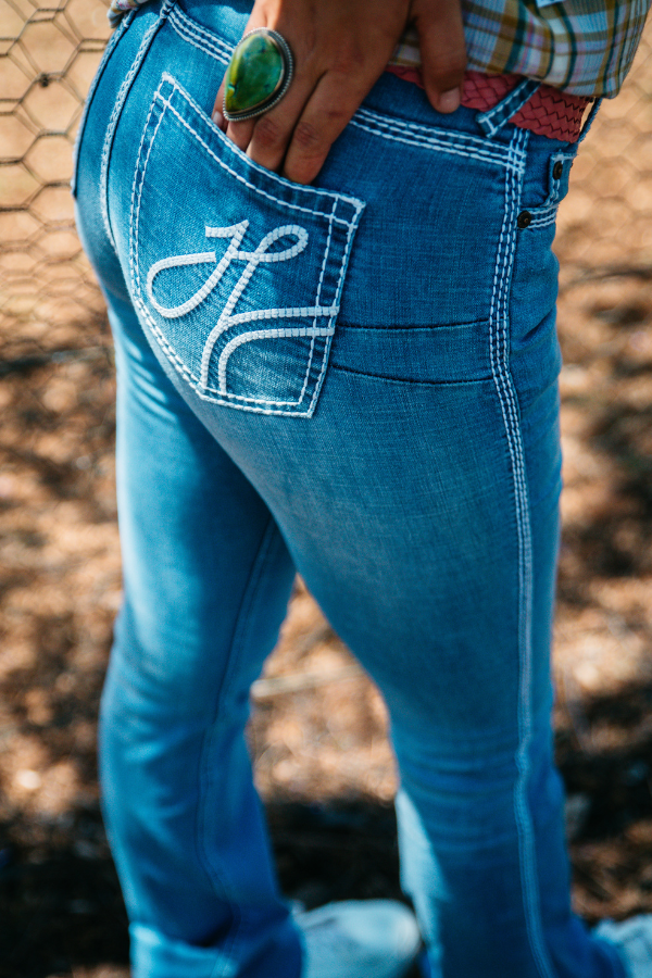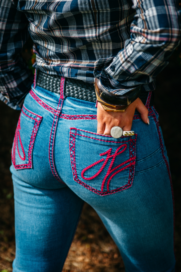 The “Indiana” is a light look denim featuring two row hot pink stitch with metallic zig-zag detail on the front and rear pockets, yoke and outer leg. Light whiskering at the thigh, and back of the knees. Light spray fronts of the thigh, back thigh and backs of the knees. Tagging detail to the back yoke and hem line. No physical distressing to the denim.