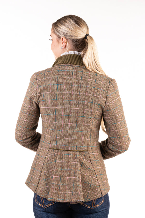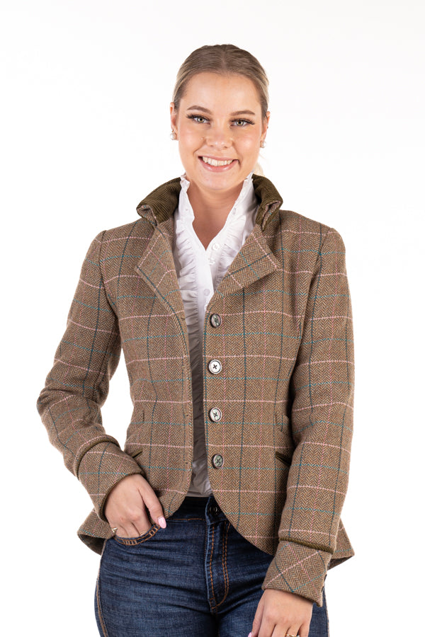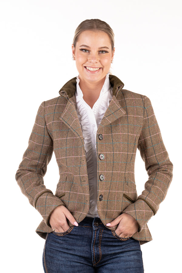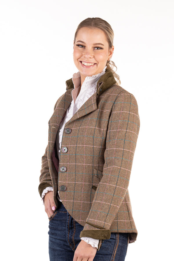 The ultimate new season tweed jacket, this classic tweed in traditional greens with burgundy and pink detailing is a beautiful statement addition to your wardrobe for this season. Be noticed in this classic cut featuring corduroy detail at the collar and cuff, inverted pleating detail at the back and a modern scooping hem. Team with skinny jeans and long boots for a touch of ‘old English charm’ to your look. Styling this jacket is limitless. Wool blend fabric. Size chart is attached